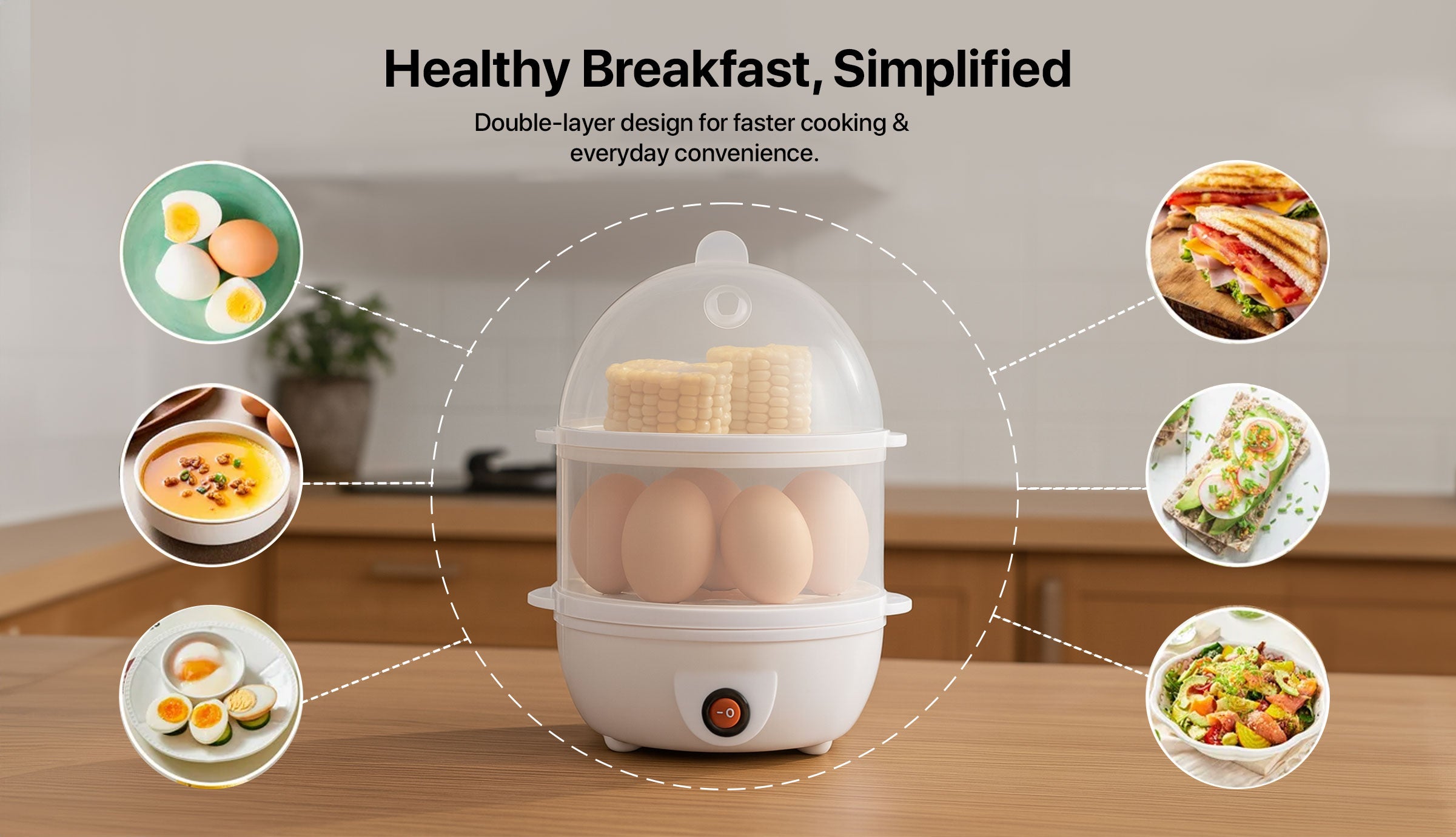 It boils the eggs in the steam generated by the heater contained in the cooker. The crystal clear top cover allows you to check whether the eggs are cooked or not, without opening the lid. This egg boiler can cook up to eggs simultaneously.