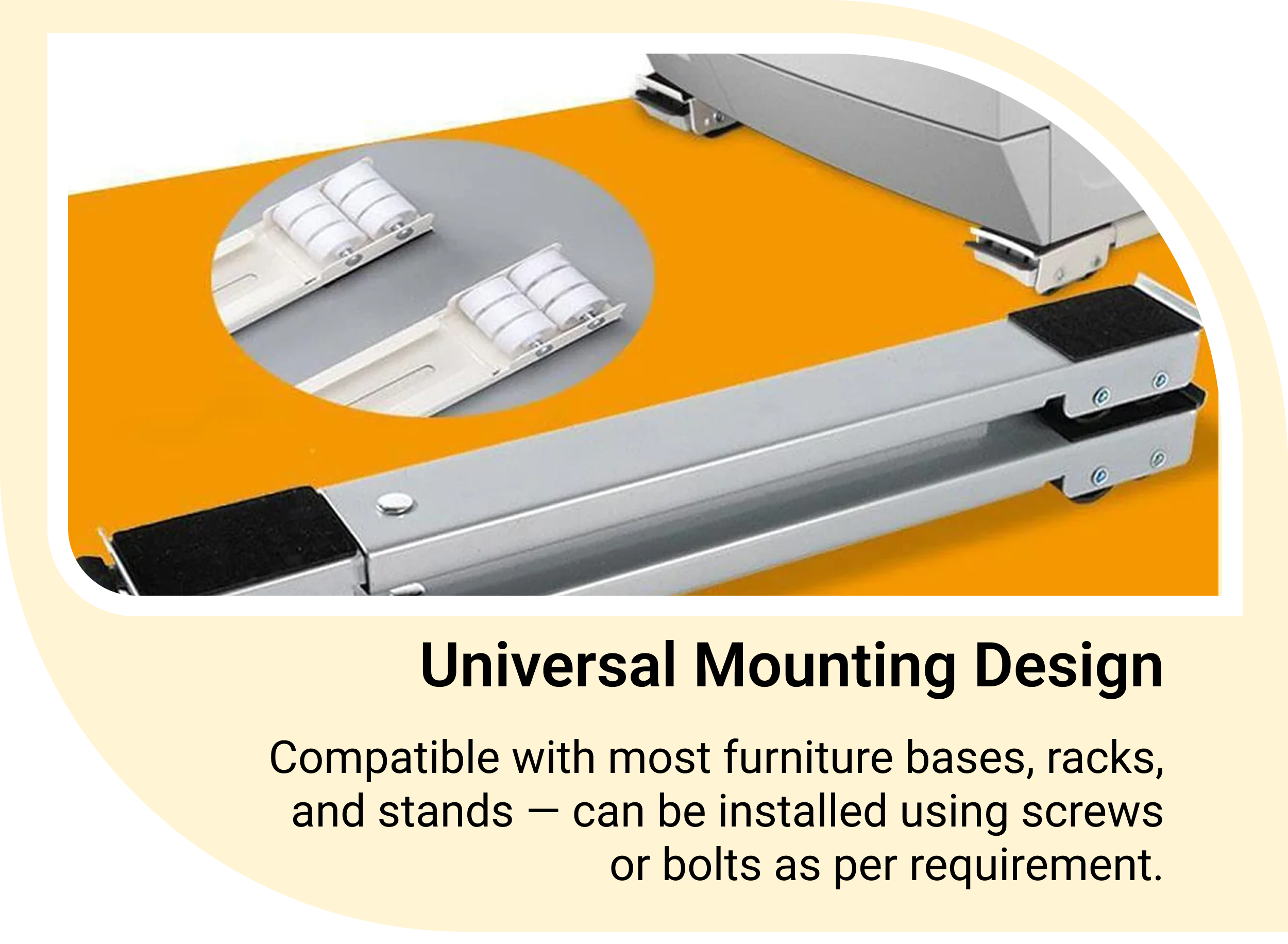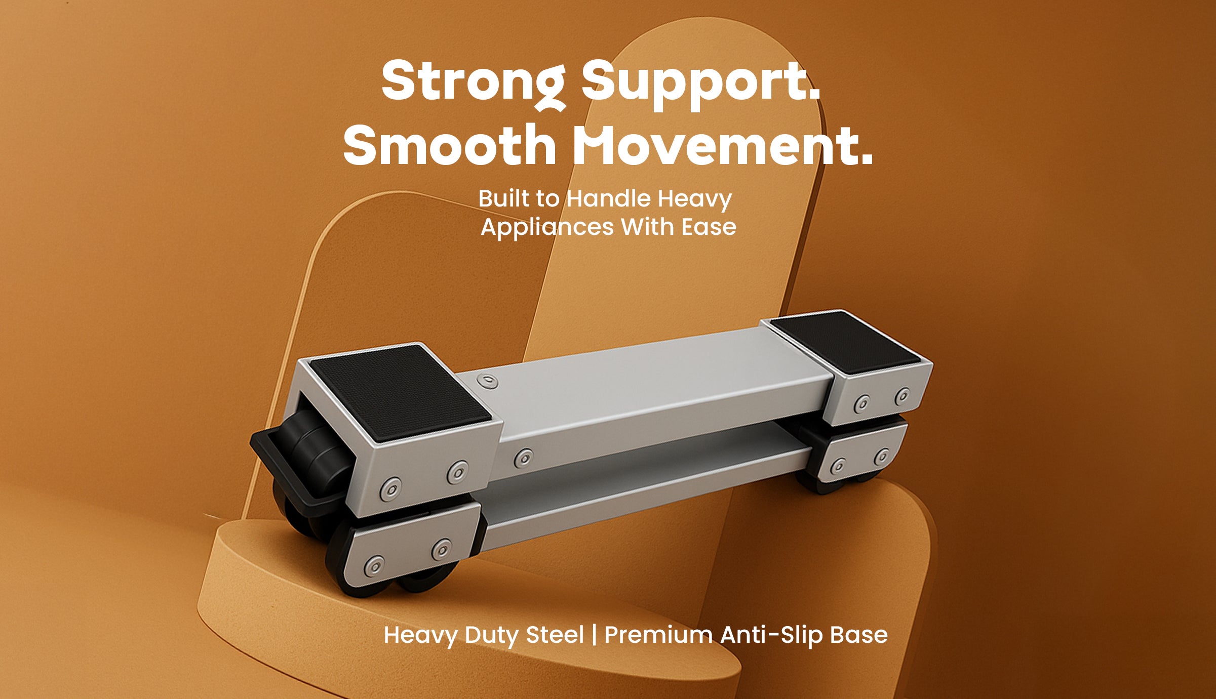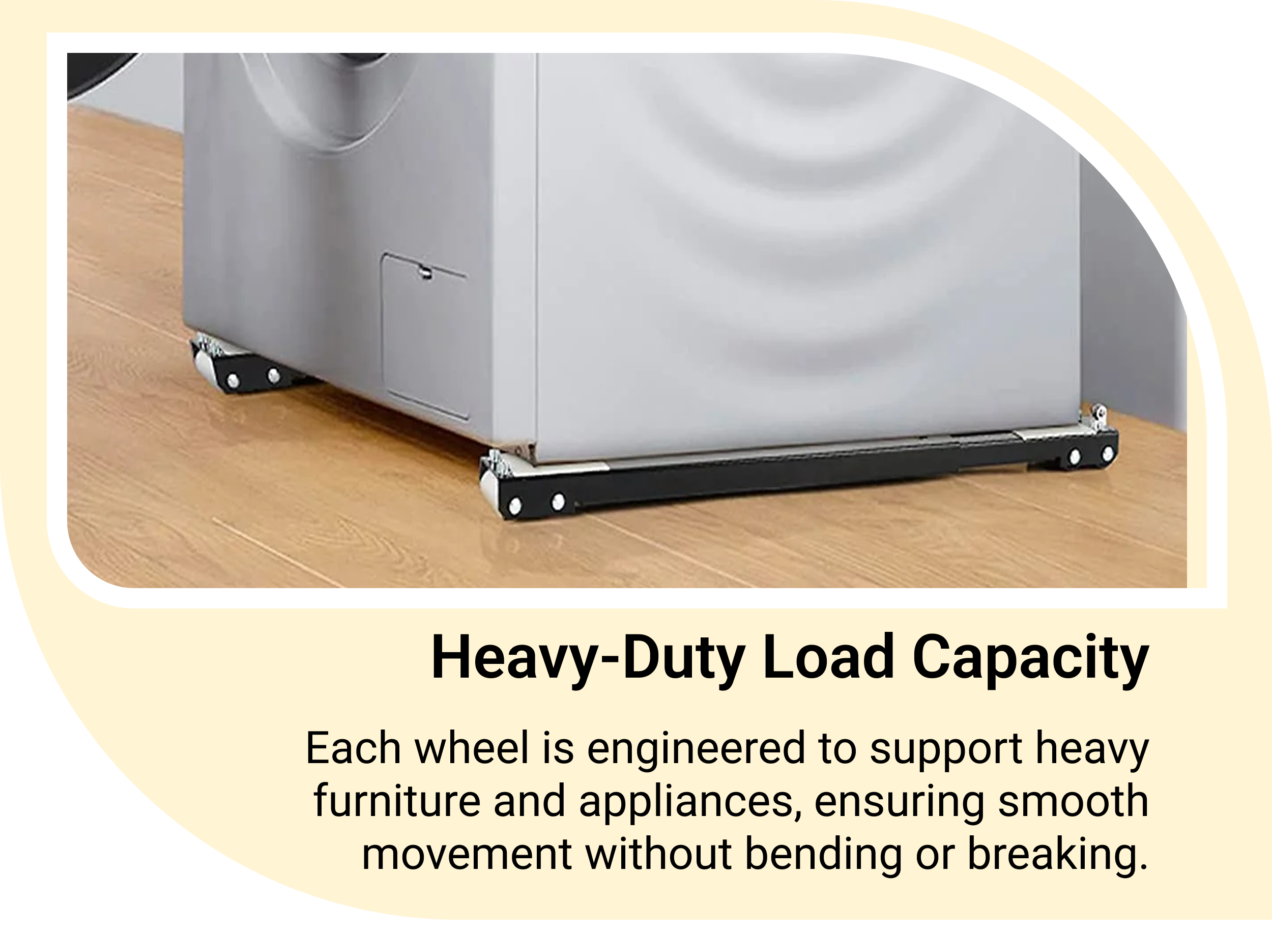 This product is a heavy-duty, adjustable roller base or stand used to elevate and mobilize large household appliances like washing machines, dryers, refrigerators, and even heavy furniture.