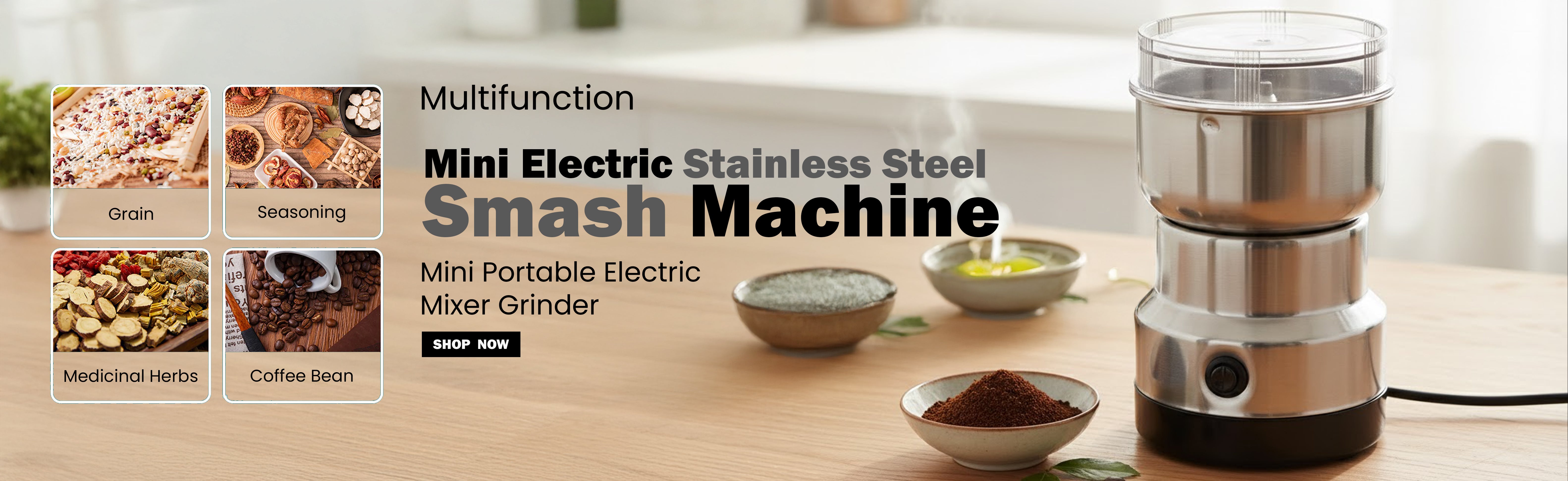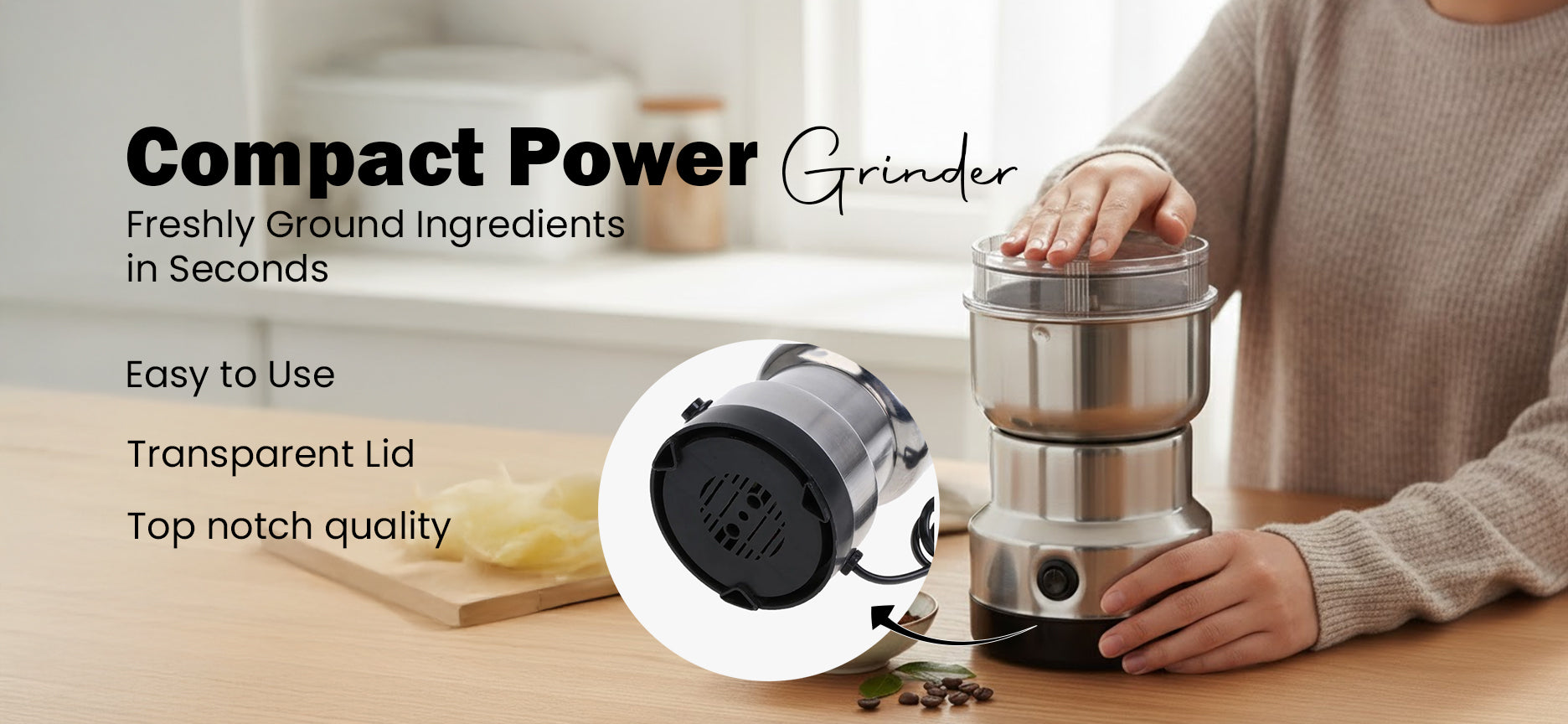 Compact, powerful electric grinder with stainless steel bowl and blades — perfect for grinding spices, grains, seeds, coffee, herbs, and more in seconds.