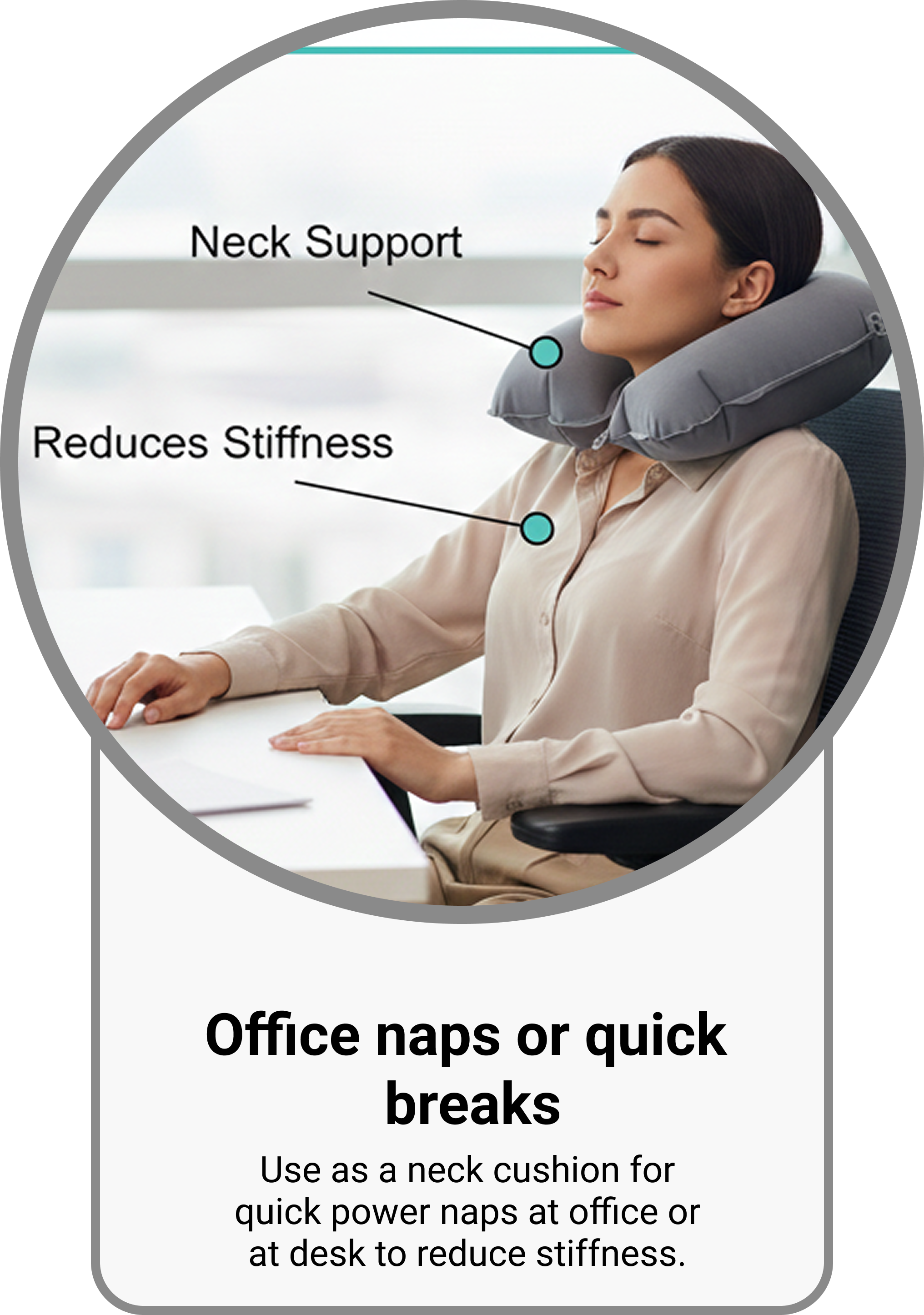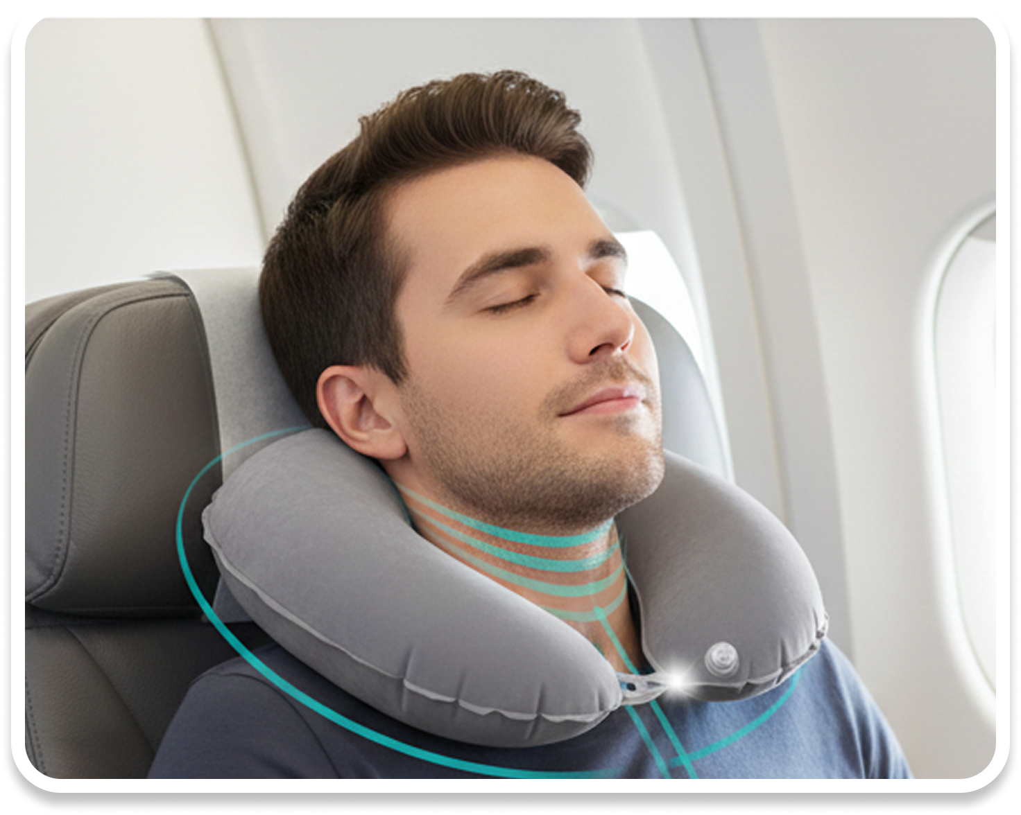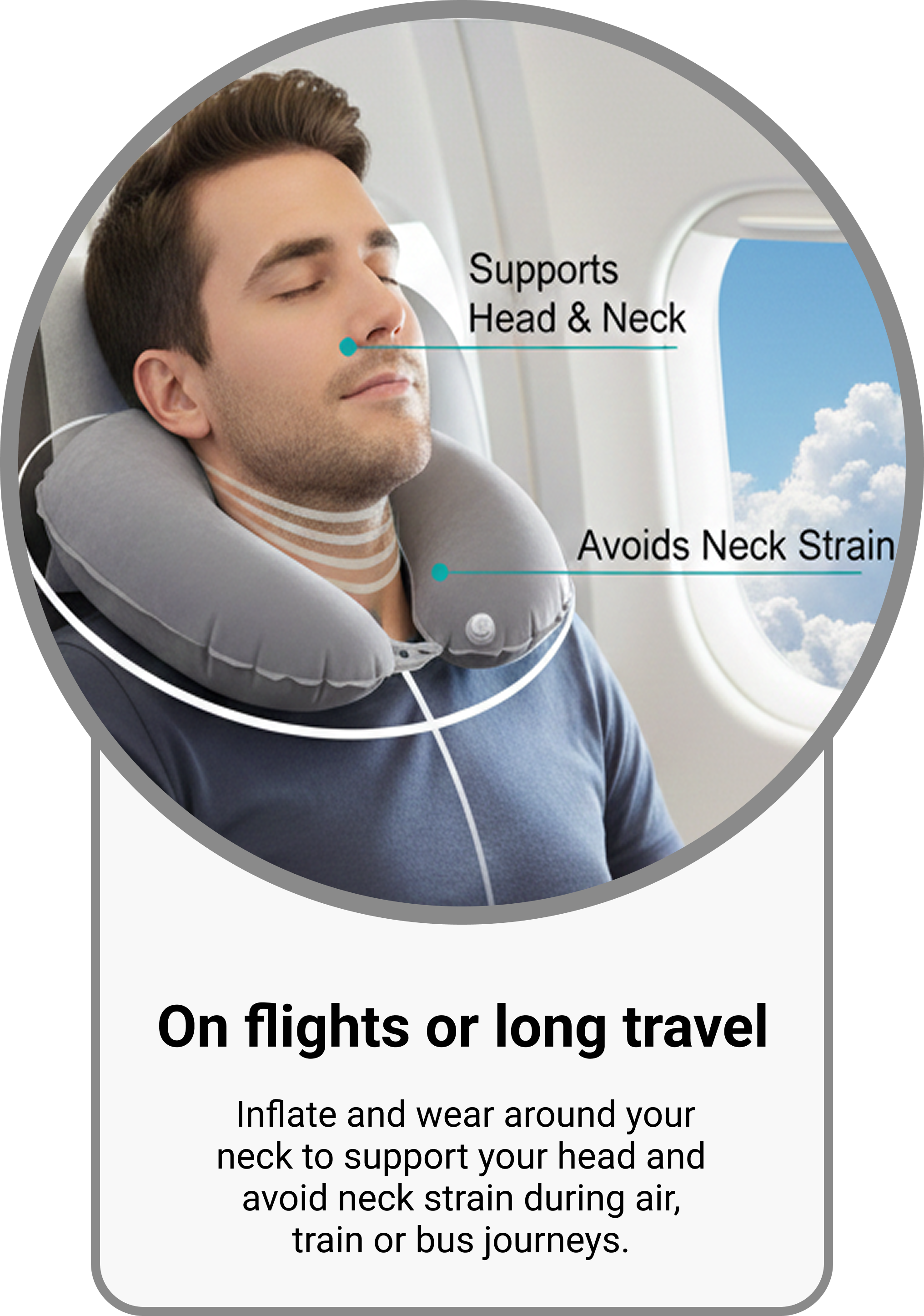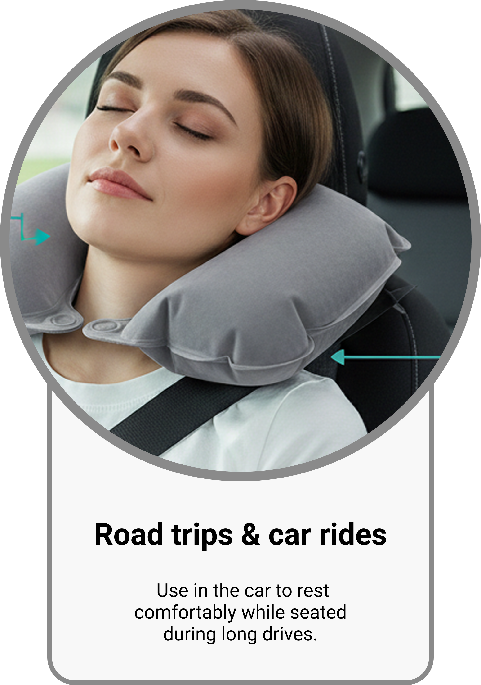 Cradles your neck and head to support natural alignment and prevent stiffness on long journeys.