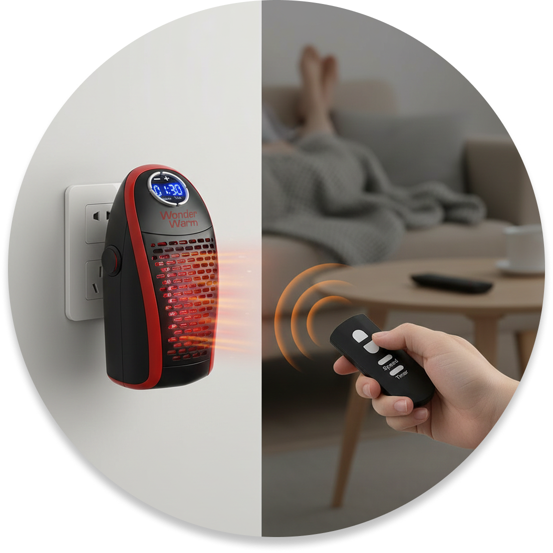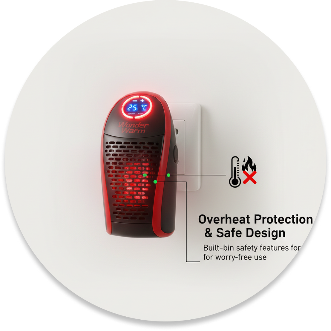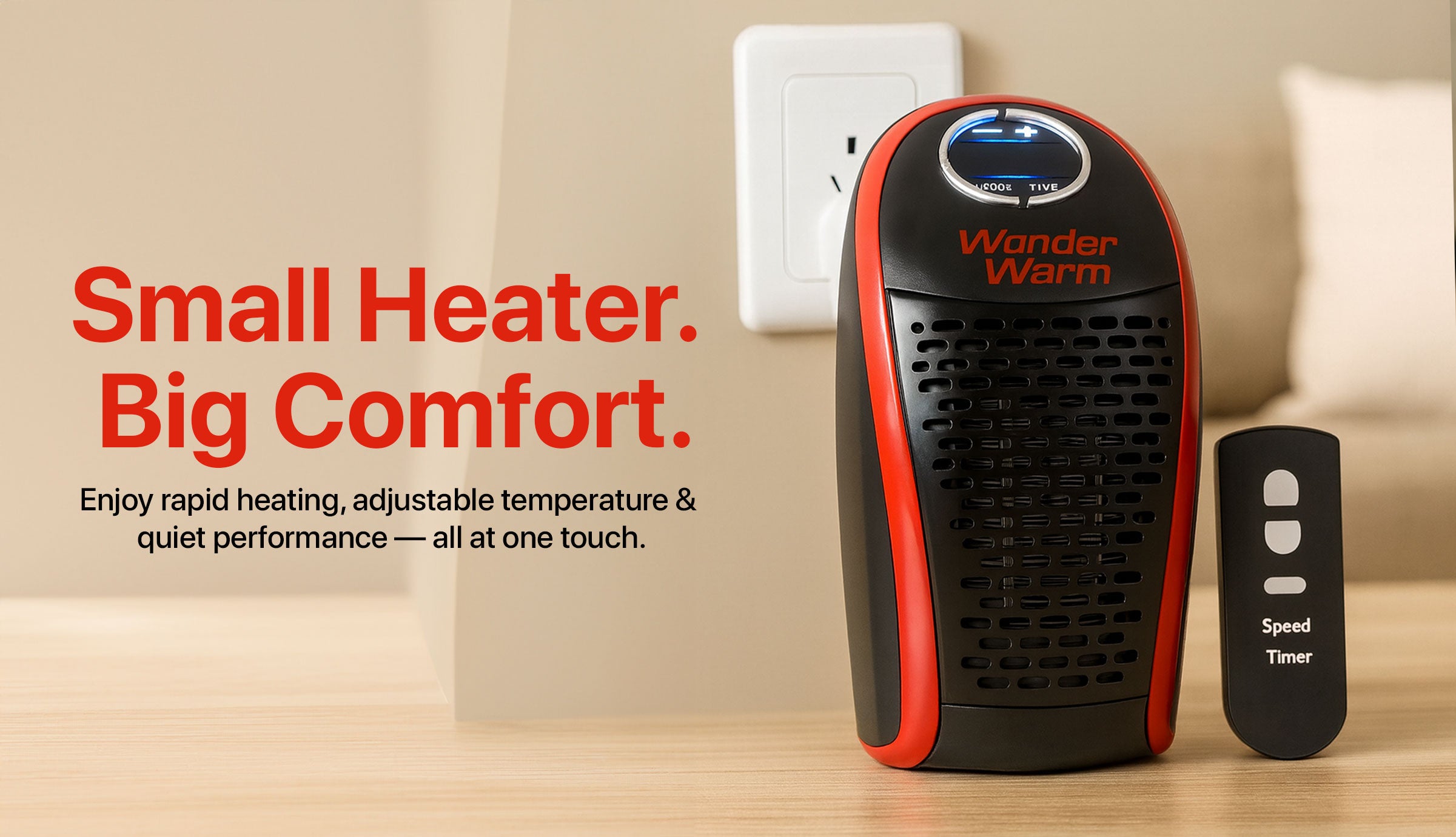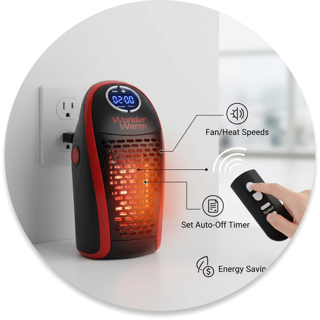 This Wonder Warm 400W wall plug room heater is designed to give you quick, comfortable warmth exactly where you need it, without bulky floor units or complicated installation. The compact heater plugs directly into a wall socket, instantly converting any corner of your home or office into a cozy personal space. Its powerful 400W heating element delivers a steady stream of warm air through a wide vent grille, helping to gently raise the room temperature while remaining energy-efficient. The included remote control allows you to adjust speed and set the timer from your bed, sofa or work desk, so you can enjoy warmth without getting up. A built-in digital control panel on the top provides easy temperature and mode setting, while the sleek black-and-red body blends neatly into modern interiors. Lightweight, portable and safe, this heater is perfect for spot heating bedrooms, study rooms, office cabins and small living spaces during chilly days and nights.