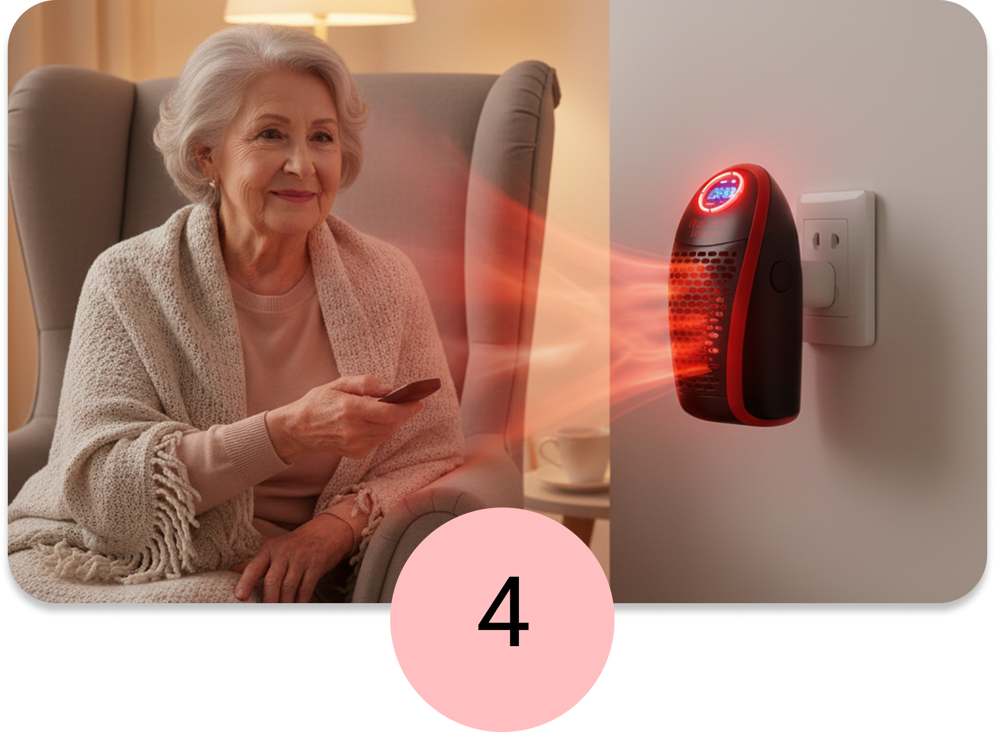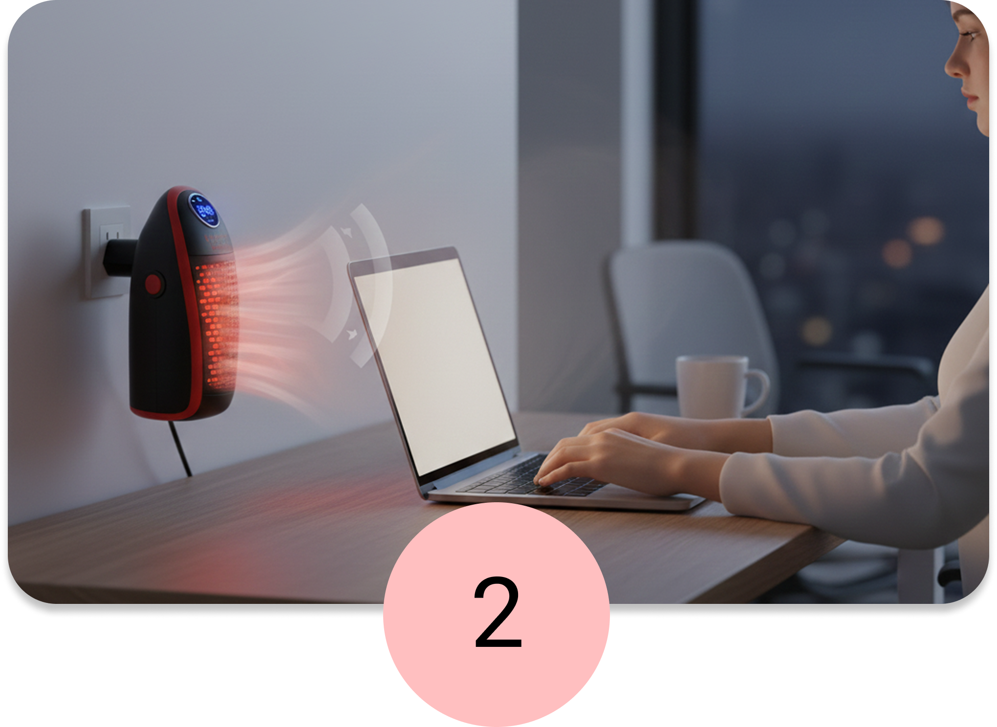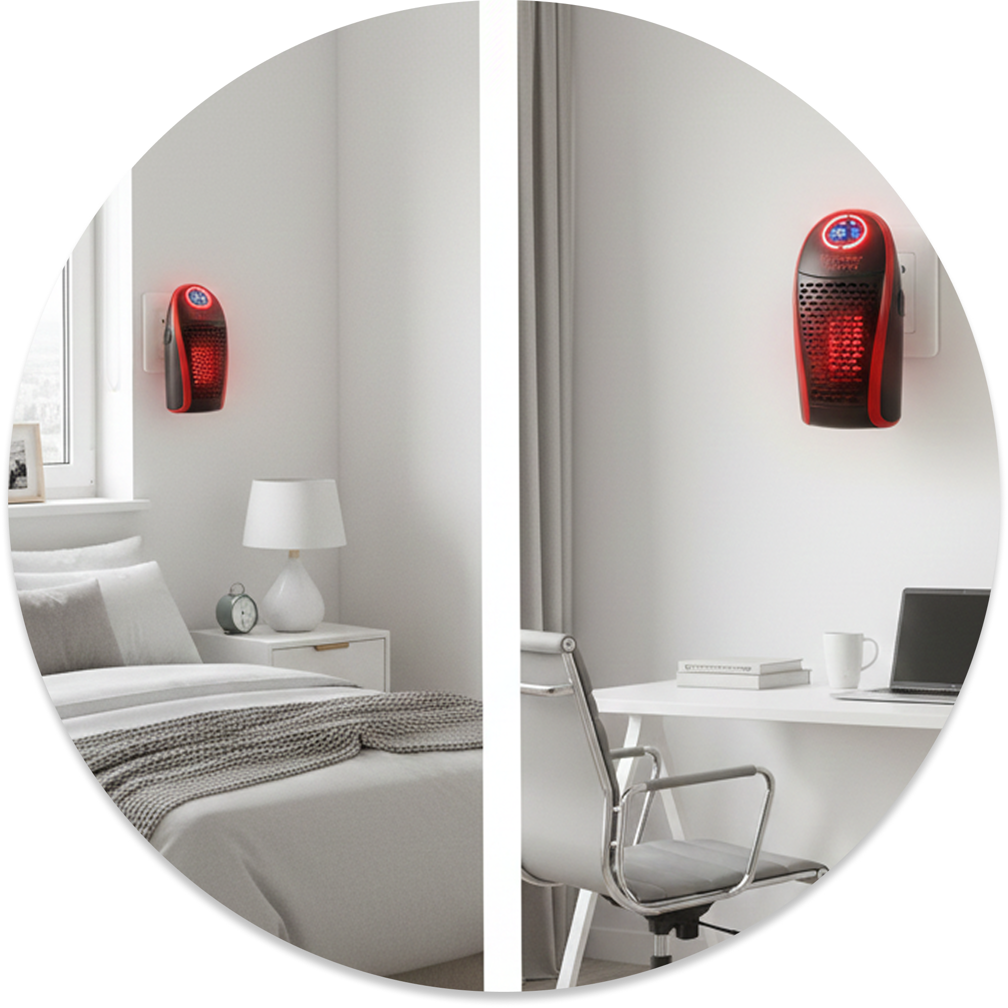 Direct wall-socket mounting saves floor space and keeps the heater safely off the ground.